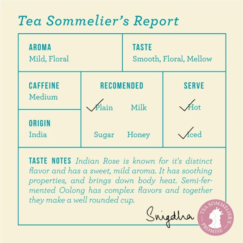 Oolong tea best enjoyed post meals, so we recommend that you sip this tea in the afternoons or mid evening. Avoid drinking this tea post dinner if you are sensitive to caffeine; it has medium caffeine content. Originating from Darjeeling, the tea pairs well with light pastries, pancakes and crepes. Tastes great either hot or iced. Enjoy the natural sweetness of real Rose petals and buds by brewing this tea without milk or sugar.